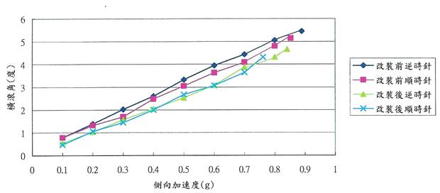 “防傾王”經過數天反覆多次的測試,由眾多精密儀器證明了其防傾能力的確較未裝之前進步許多,並能有效降低加諸於車身及乘客之G-Force(側向離心力),直接降低過彎時的拋離壓迫感,這都可以由最後的”定圓迴轉傾斜量檢測結果”(圖六)看出來。
