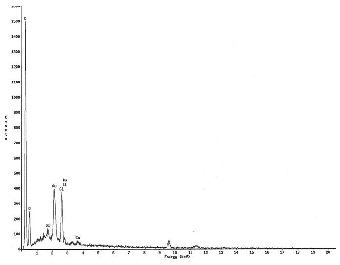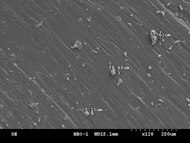 可知本材質於切斷時會有細小的碎屑產生, 並黏附於表面, 觀測方法採用真空電鍍黃金薄膜於防傾王上以後再進行觀測, 其材質成分可由圖二之EDS