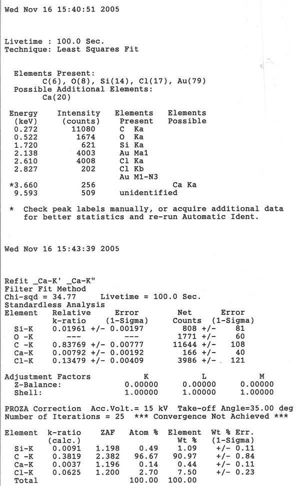 圖譜得知, 材質主要分別為C(6),O(8),Si(14),Cl(16), 其原始量測資料數據如附錄一 。